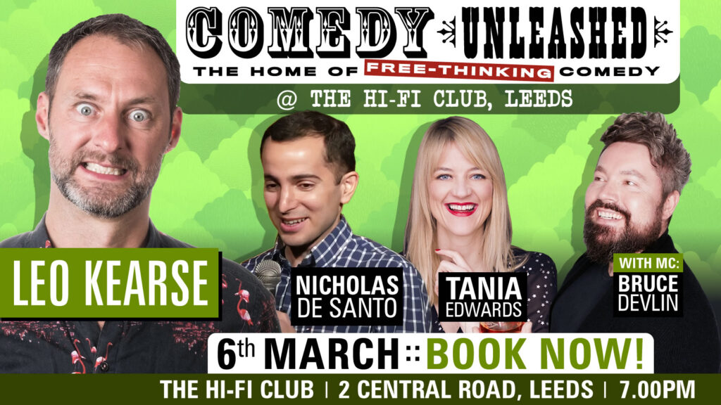 Free-thinking stand-up comedy with Leo Kearse, Nicholas De Santo, Tania Edwards, with Bruce Devlin as MC. Doors open 6.30pm. Show starts 7.00pm and finishes at 10pm. Artists on the bill may change.