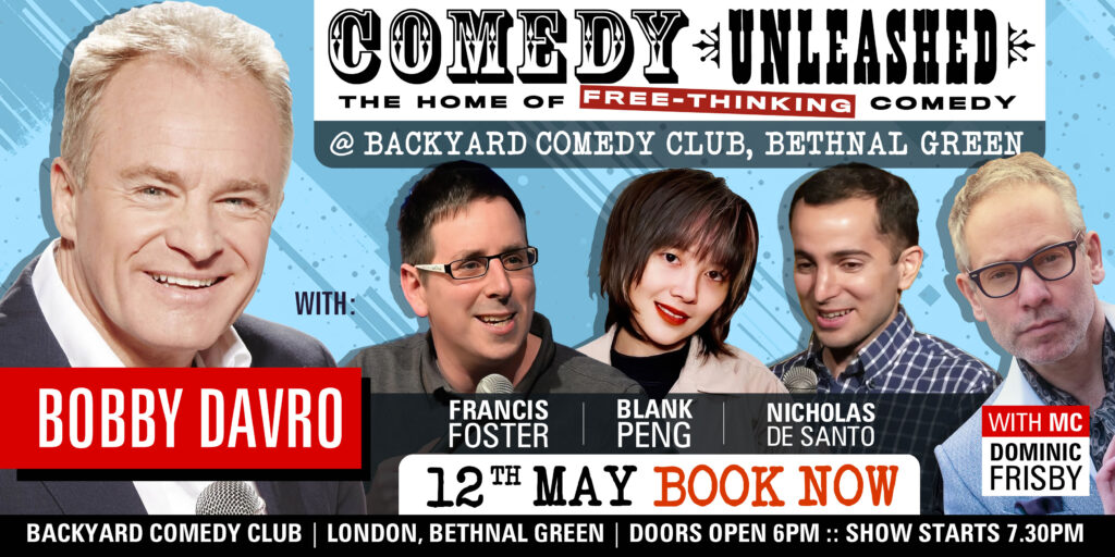 A night of free-thinking comedy with comedians who don’t self-censor. With Bobby Davro, Francis Foster, Blank Peng, Nicholas De Santo and MC Dominic Frisby. Doors open and food and drinks available from 6pm. Show starts 7.30pm and finishes at 10pm. Artists on the bill may change.