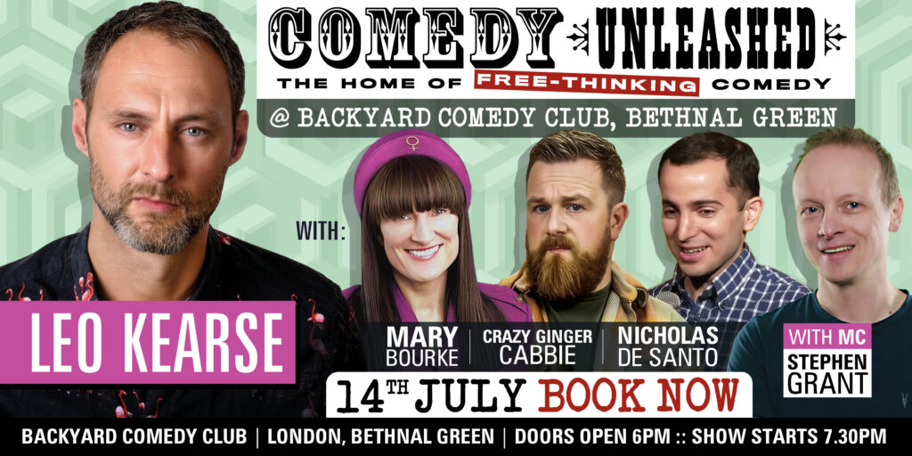 A night of free-thinking comedy with comedians who don’t self-censor. With headliner Leo Kearse. Also, Crazy Ginger Cabbie, Mary Bourke, Nicholas de Santo, & MC Stephen Grant. Doors open 6pm. Food is available from 6.30pm. Show starts 7.30pm and finishes at 10pm. Artists on the bill may change.