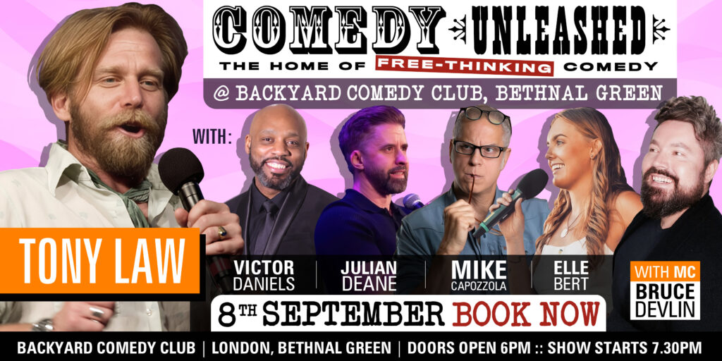 A night of free-thinking comedy with comedians who don’t self-censor. With: Headliner Tony Law, Victor Daniels, Julian Deane, Mike Capozzola, Elle Bert and MC Bruce Devlin. Doors open 6pm. Doors open and food and drinks available from 6pm. Show starts 7.30pm and finishes at 10pm. Artists on the bill may change.