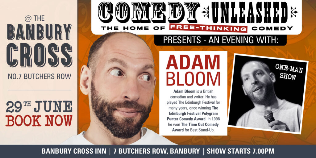Comedy Unleashed at The Banbury Cross is proud to present an evening with Adam Bloom. It’s an in-person event, so get ready to soak up the laughs live with a great crowd. Show starts at 7.00pm.